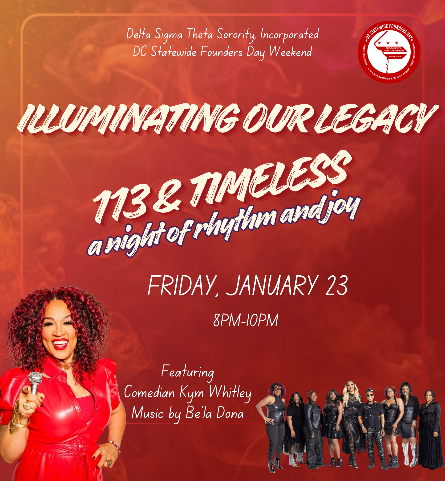 The Washington DC Alumnae Chapter of Delta Sigma Theta Sorority, Inc., invites you to the DC Statewide Founders Day Weekend Celebration, 113 & Timeless: A Night of Rhythm & Joy, on Friday, January 23, 2026, at Cramton Auditorium, Howard University.