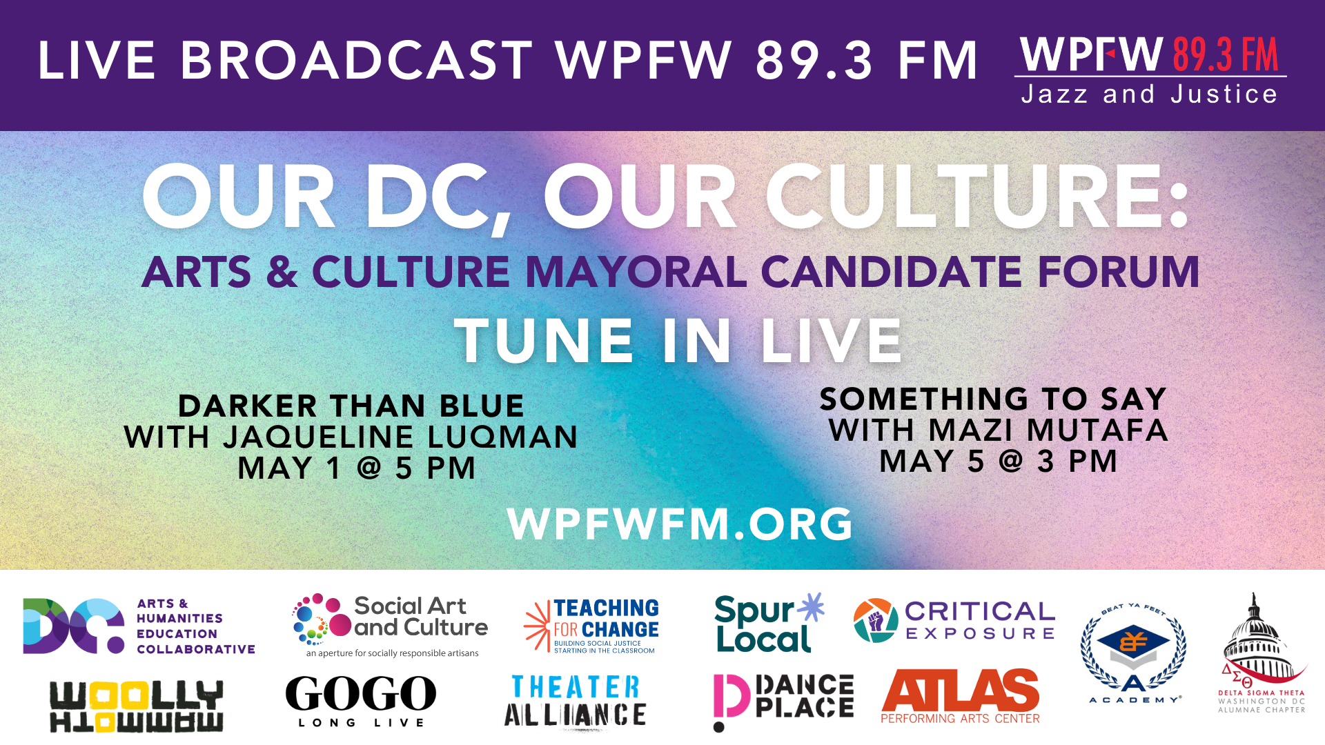The Washington DC Alumnae Chapter’s Social Action Committee is excited to partner on Our DC, Our Culture: Arts & Culture Mayoral Candidate Forum, a nonpartisan voter education live broadcast on WPFW 89.3 FM.